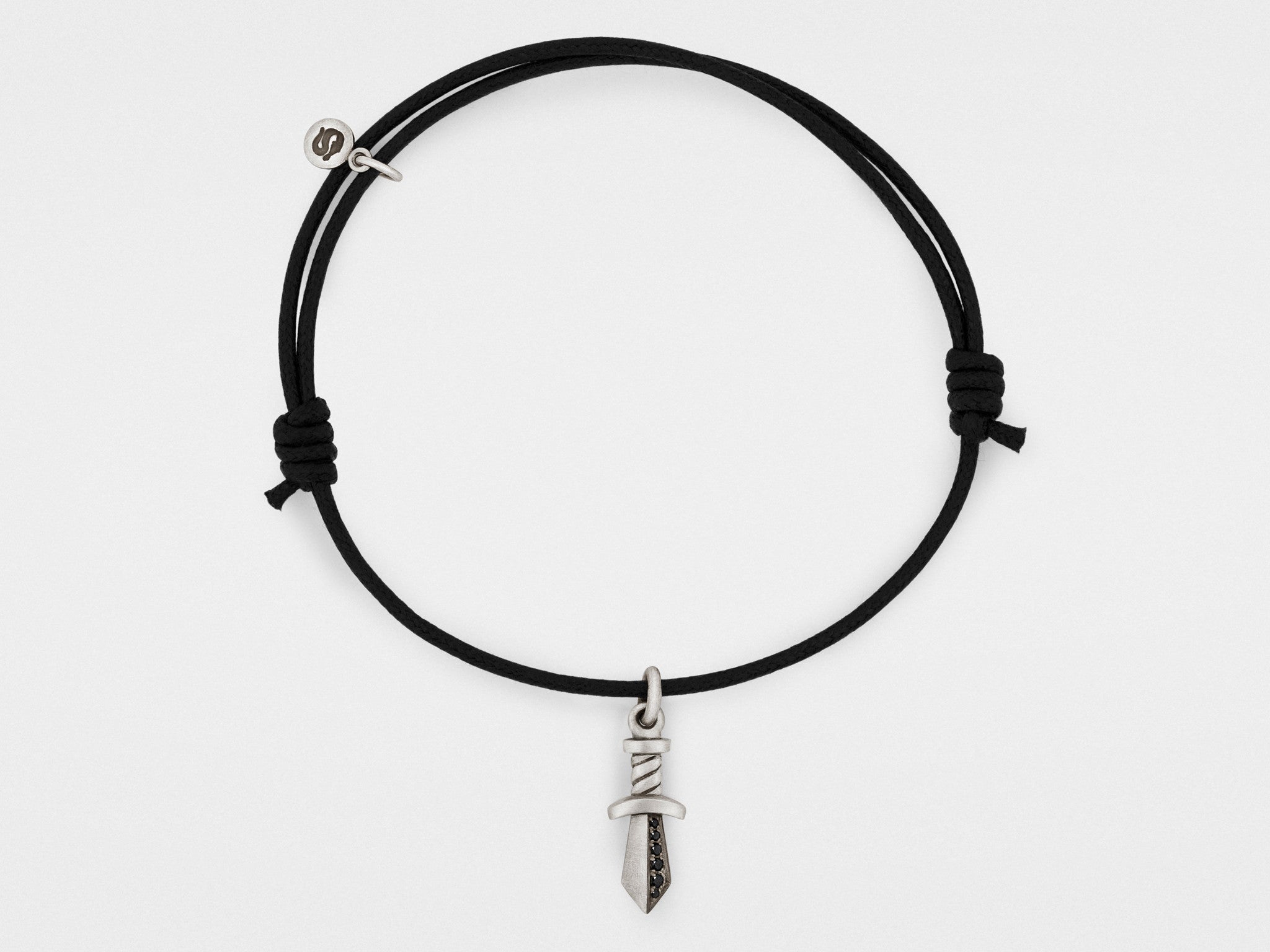 Ce pendentif en forme d'épée sculptée à la main est notre interprétation d'un modèle classique. D'un poids agréable, il offre une sensation de luxe. L'un des côtés de l'épée est serti de diamants noirs taille brillant, dans un pavage éclatant. Monté sur un cordon Mokuba ciré ajustable.
