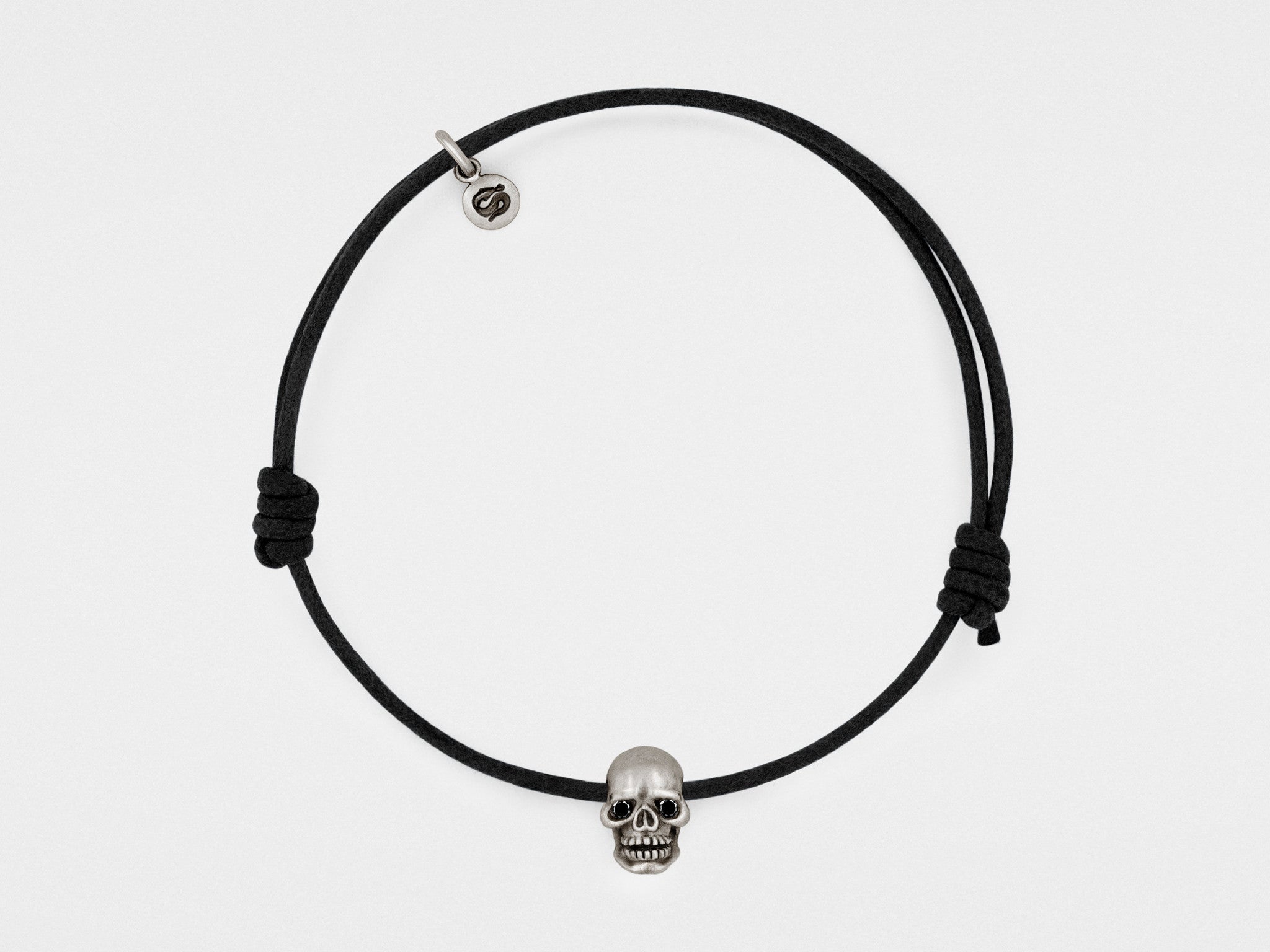 Célébrez la vie avec ce bracelet en argent massif 925 orné d'une tête de mort aux yeux de diamants noirs. Chaque pièce est finie à la main en argent massif oxydé pour un aspect vintage et artisanal, et présente une patine unique. Monté sur un cordon ajustable en coton ciré. Argent massif 925, cordon en coton ciré. Têtes de mort serties de diamants noirs. Finition mate oxydée. Dimensions : la tête de mort mesure environ 7,5 x 11 mm.