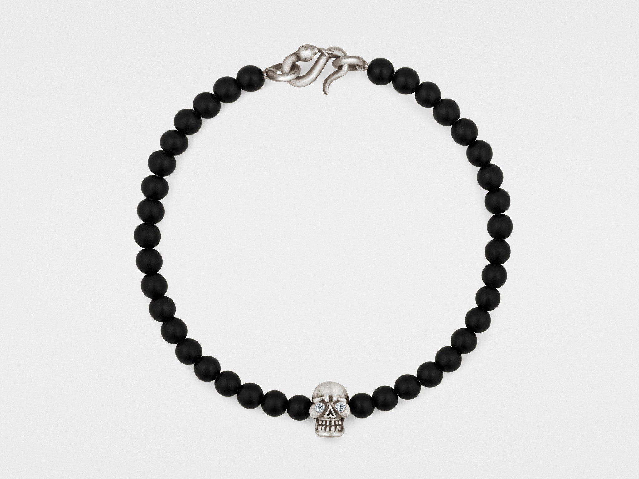 Fabriqué à la main en argent sterling oxydé, ce bracelet classique est orné d'un crâne serti de deux magnifiques diamants aux yeux, apportant une touche de sophistication. Cette version luxueuse d'un bracelet très apprécié présente un rang de perles d'onyx noir à la finition mate et un fermoir serpent en argent. Chaque pièce est confectionnée par un maître artisan dans notre atelier new-yorkais et réalisée sur commande.