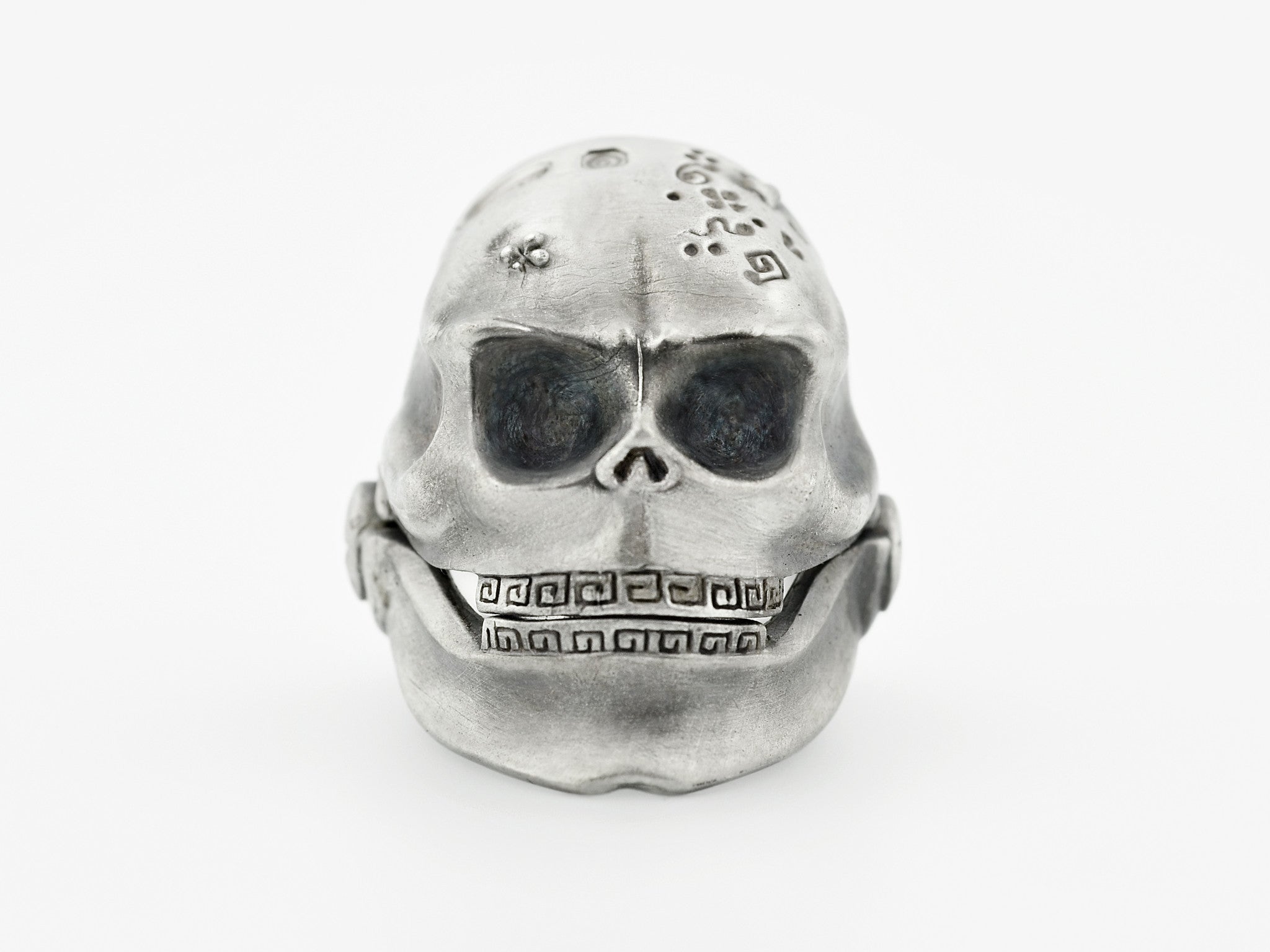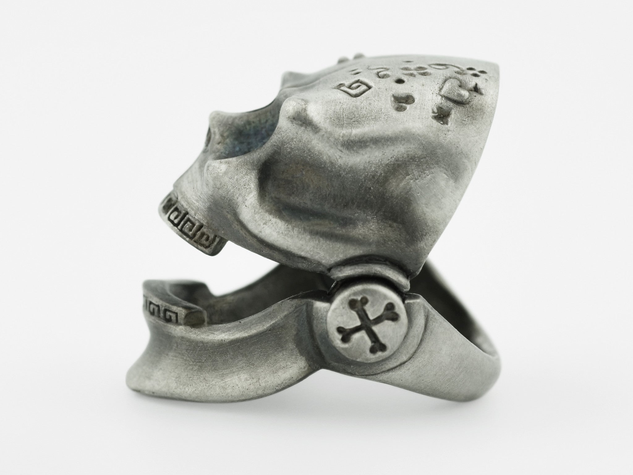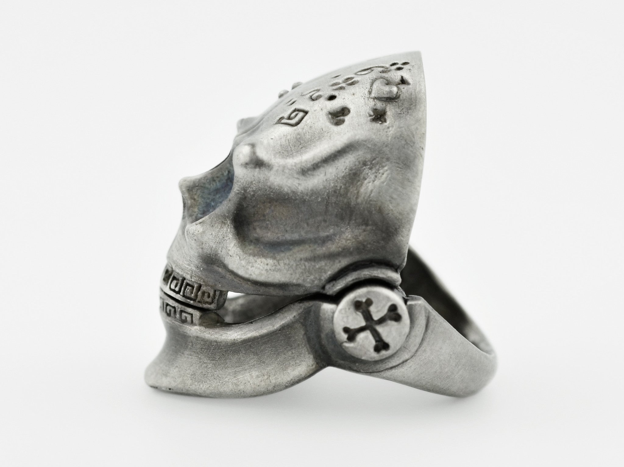 Voici une bague biker/rock originale, créée par Anatoly Startsev. Cette grande bague de haute qualité présente un design unique évoquant une mâchoire ouverte et un motif de cartes à jouer. Chaque pièce est méticuleusement fabriquée à la main pour un style unique et distinctif.