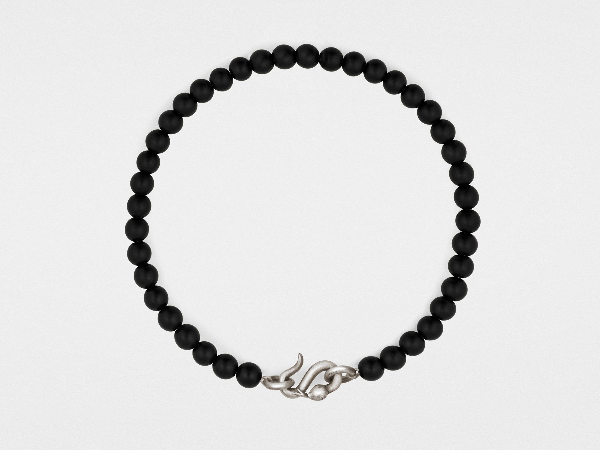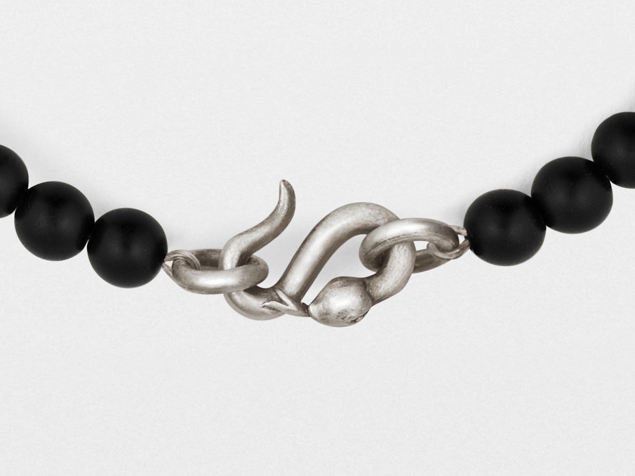 Fabriqué à la main en argent sterling oxydé, ce bijou luxueux revisité, très apprécié, est orné d'un rang de perles d'onyx noir à la finition mate et de notre fermoir serpent signature. Chaque pièce est confectionnée par un maître artisan dans notre atelier new-yorkais et réalisée sur commande.