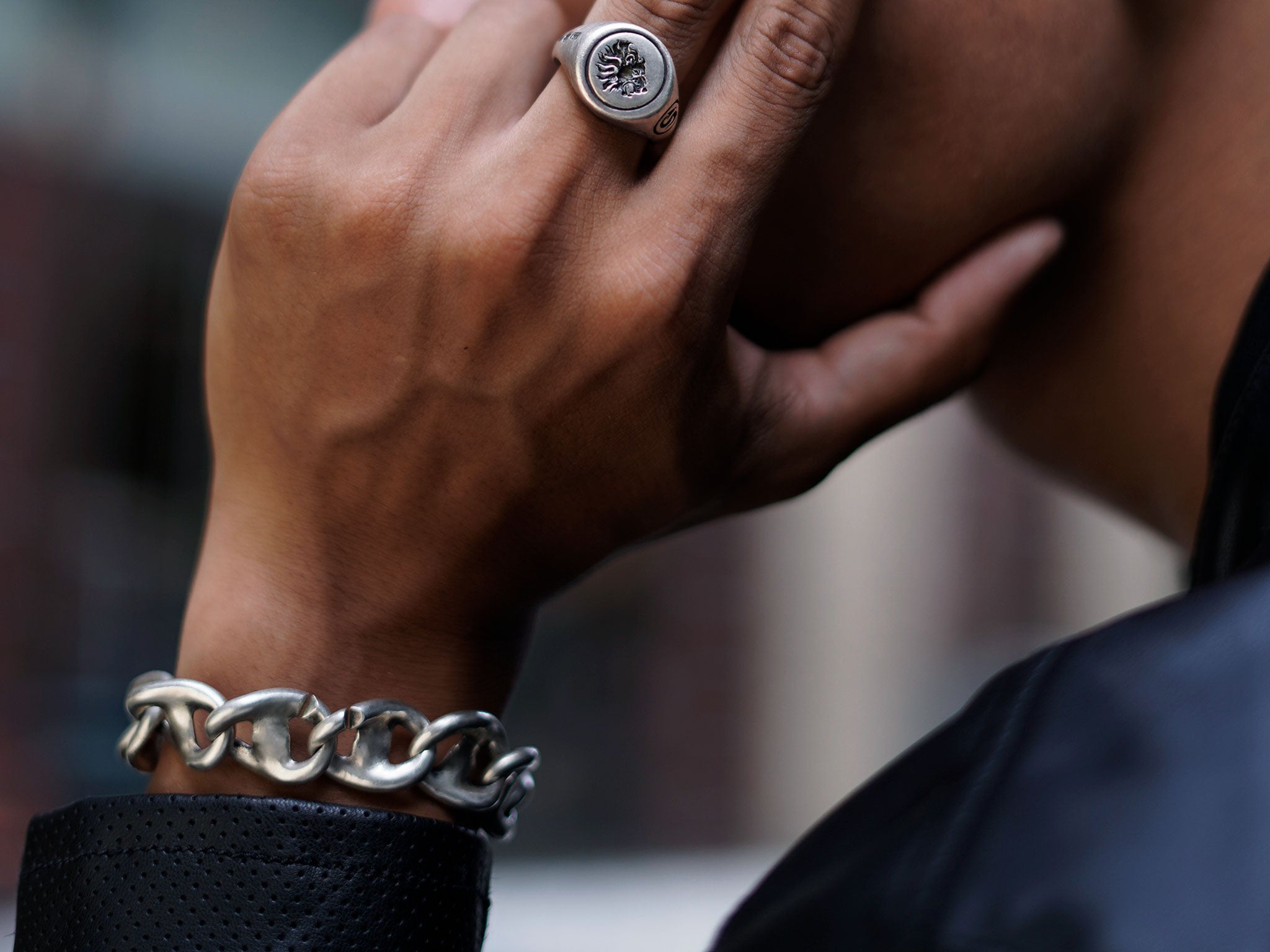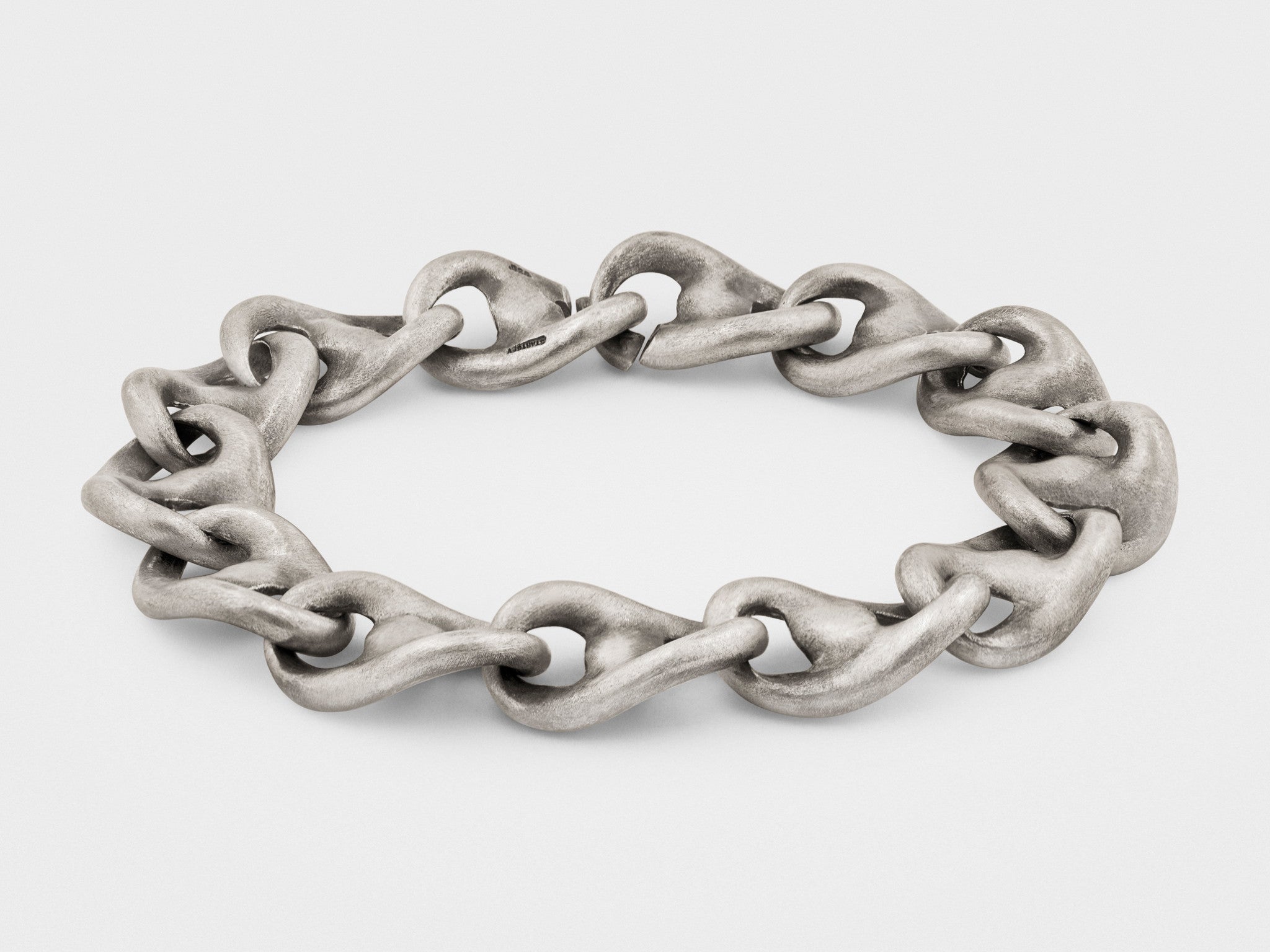 Ce bracelet à maillons finement sculptés est fabriqué à la main à partir de grands maillons ondulés pour former une chaîne parfaite qui se ferme grâce à un fermoir invisible.